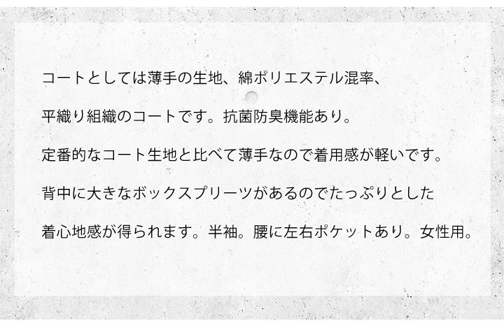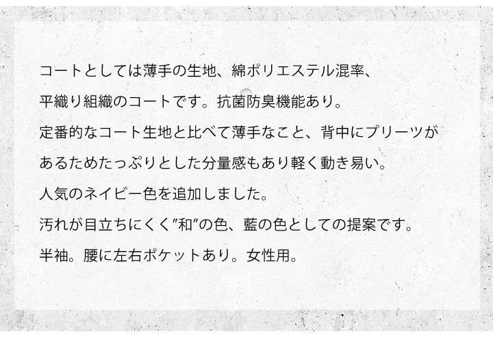 他の画像を見る 定番調理用コート。抗菌防臭加工生地使用。 セブンユニフォーム AA332 コート半袖 女性用 レディース 抗菌防臭 レストラン 調理用 厨房 白衣 飲食店 本体価格 ¥ 3,465 税込 カートに入れる お気に入りに登録する