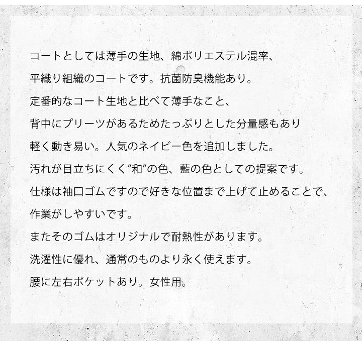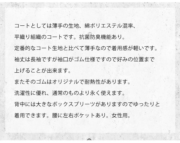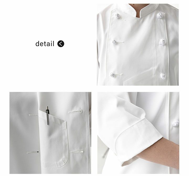 他の画像を見る 定番調理用コート。抗菌防臭加工生地使用。 セブンユニフォーム AA336 コート長袖 女性用 レディース 抗菌防臭 レストラン 調理用 厨房 白衣 飲食店 本体価格 ¥ 3,630 税込 カートに入れる お気に入りに登録する