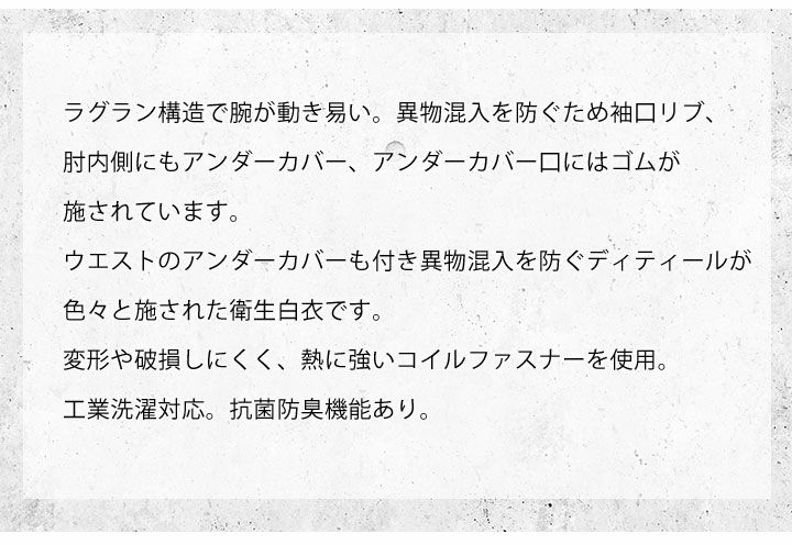 他の画像を見る 衛生白衣長袖。細部まで徹底した衛生仕様で、製品への異物混入(毛髪等の落下)を防止。 セブンユニフォーム AA401 コート 長袖 男女兼用 メンズ レディース 抗菌防臭 レストラン 調理用 厨房 白衣 飲食店 本体価格 ¥ 4,290 税込 カートに入れる お気に入りに登録する