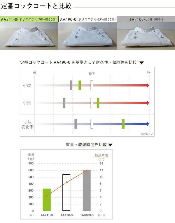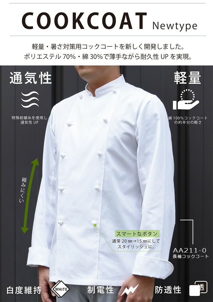 他の画像を見る 「できるだけ涼しいコックコートが欲しい」というリアルな現場の声から生まれた「涼感コックコート」綿100%の約1.6倍の通気量、約-1.06℃の温度差を実現。 セブンユニフォーム 長袖コックコート AA211-0 涼しい 男女兼用 軽量 通気性 防透性 制電 厨房 キッチン 飲食業 レストラン 白衣 SEVEN UNIFORM【SS-LL】 本体価格 ¥ 3,200 税込 カートに入れる お気に入りに登録する