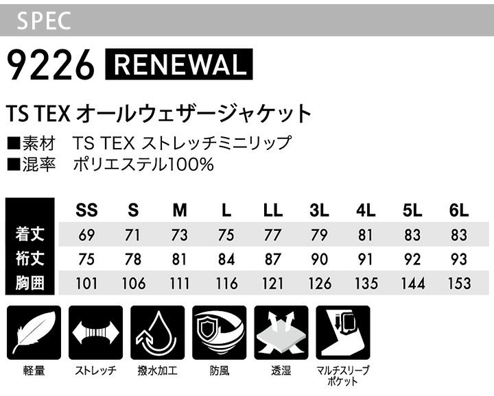 他の画像を見る 「TS TEX」フィルムにより防風・高透湿・耐水圧を実現 。 TS-DESIGN TS TEX オールウェザージャケット 9226 秋冬 メンズ ブルゾン ジャンパー 軽量 ストレッチ 撥水 防風 透湿 アウトドア 作業服 作業着 藤和【5L-6L】 本体価格 ¥ 8,800 税込 カートに入れる お気に入りに登録する