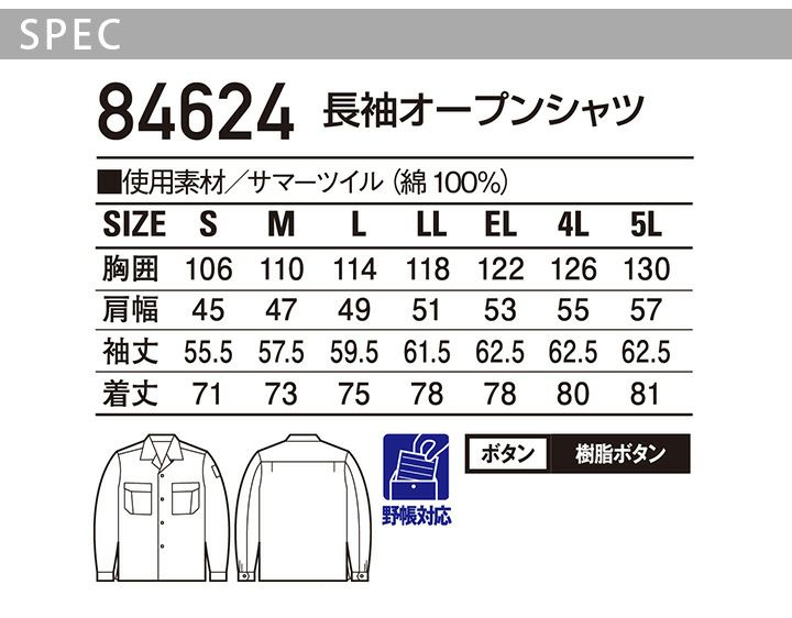他の画像を見る ハードワーカーのための綿100%ウェア。 長袖オープンシャツ 自重堂 84624 メンズ 秋冬 綿100% 作業服 作業着 定番【4L-5L】 本体価格 ¥ 3,520 税込 カートに入れる お気に入りに登録する