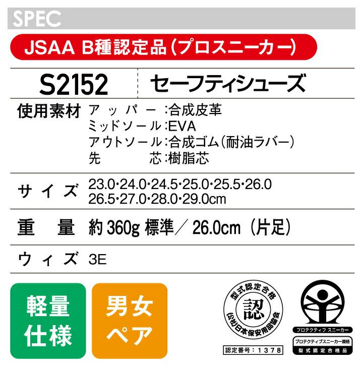 他の画像を見る マジックタイプで履きやすい軽量セーフティシューズ。 セーフティシューズ S2152 安全靴 JSAA B種認定品 プロスニーカー 軽量 男女ペア メンズ レディース フィールドメッセージ 自重堂 作業靴 マジックテープ 本体価格 ¥ 3,370 税込 カートに入れる お気に入りに登録する