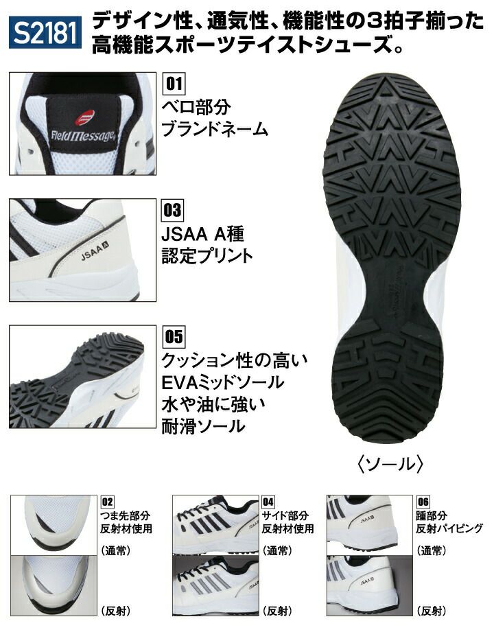 他の画像を見る 高機能スポーツテイストシューズ。 安全靴 セーフティシューズ S2181 JSAA A種認定品 プロスニーカー 衝撃吸収 耐滑 反射材 軽量 男女ペア メンズ レディース フィールドメッセージ 自重堂 作業靴 紐タイプ 本体価格 ¥ 2,860 税込 カートに入れる お気に入りに登録する
