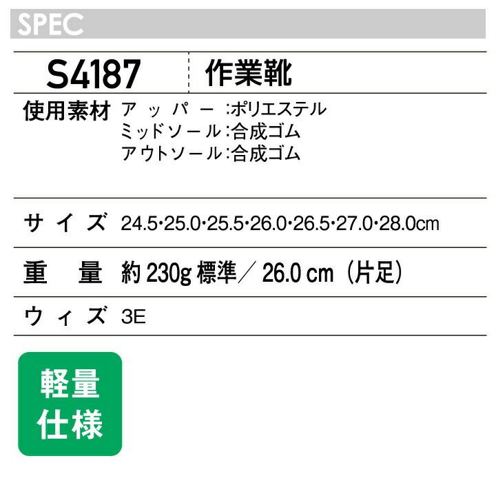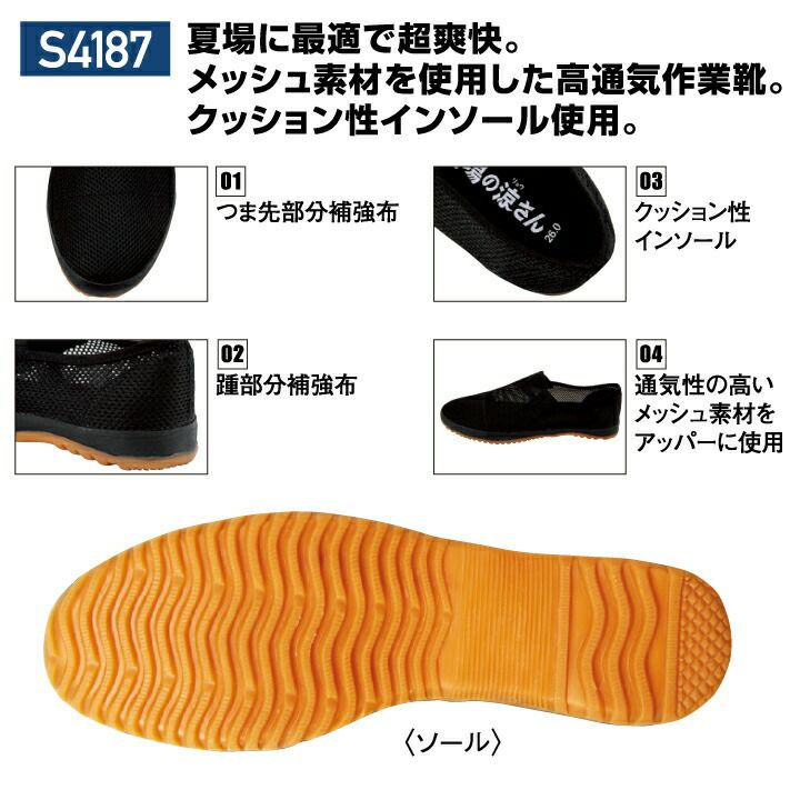 他の画像を見る メッシュ素材を使用した高通気作業靴。 作業靴 S4187 シューズ メッシュ 現場の涼さん 軽量 クッション性 室内 屋内 室内履き 自重堂 作業靴 夏場に最適 涼しい カモフラ 迷彩 本体価格 ¥ 690 税込 カートに入れる お気に入りに登録する