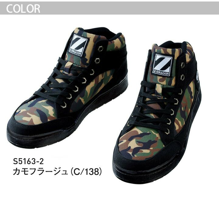 他の画像を見る カジュアル感覚で履きこなす、ホールド性の高いシューズ。 Z-DRAGON 安全靴 セーフティシューズ S5163-2 ハイカット カモフラ 迷彩 耐滑 紐タイプ 自重堂 作業靴 かっこいい おしゃれ 本体価格 ¥ 2,975 税込 カートに入れる お気に入りに登録する