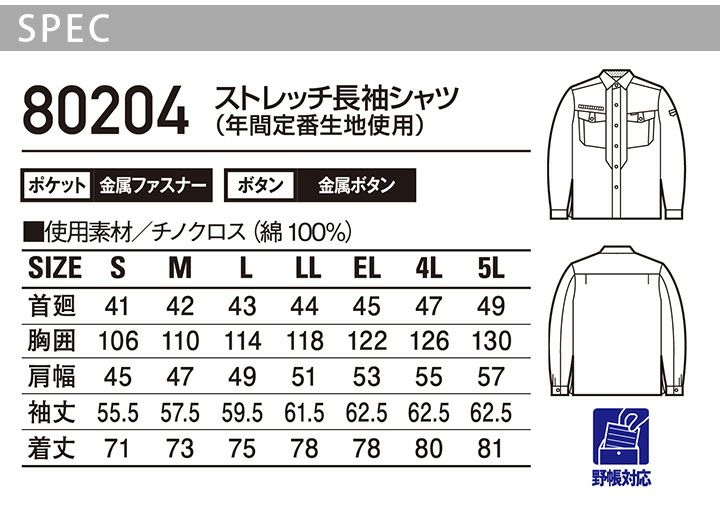 他の画像を見る 洗練されたデザインが、ワークシーンを変える。防縮防シワ加工が、縮みにくく、シワになりにくい優れたイージーケア性と、ソフトな風合いを実現。 ストレッチ長袖シャツ 自重堂 80204 男性用 メンズ 秋冬 年間 オールシーズン 綿100% 防縮防シワ加工 作業服 作業着 定番【4L-5L】 本体価格 ¥ 3,960 税込 カートに入れる お気に入りに登録する
