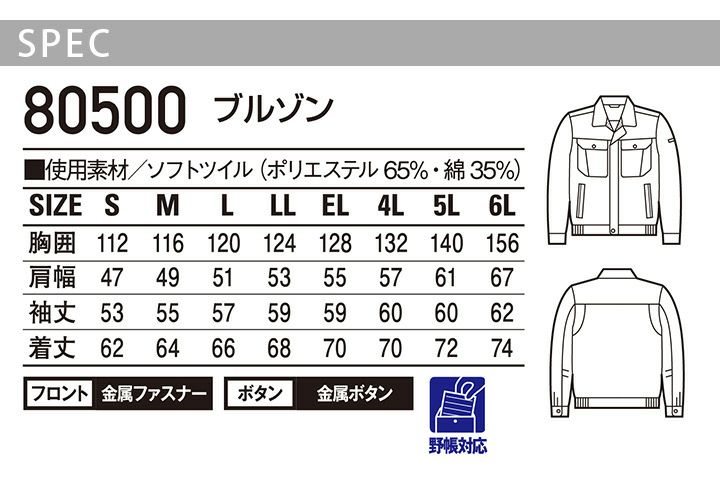 他の画像を見る ソフトな着心地、耐久性といった基本性能も追求した新定番スタイル。 長袖ブルゾン 自重堂 80500 男女兼用 メンズ レディース 秋冬 作業服 作業着 ジャケット ジャンパー【4L-6L】 本体価格 ¥ 3,990 税込 カートに入れる お気に入りに登録する