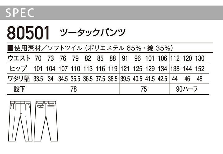 他の画像を見る ソフトな着心地、耐久性といった基本性能も追求した新定番スタイル。 ツータックパンツ 自重堂 80501 男性用 メンズ 秋冬 帯電防止 作業服 作業着 定番 ズボン スラックス【91-106】 本体価格 ¥ 3,210 税込 カートに入れる お気に入りに登録する