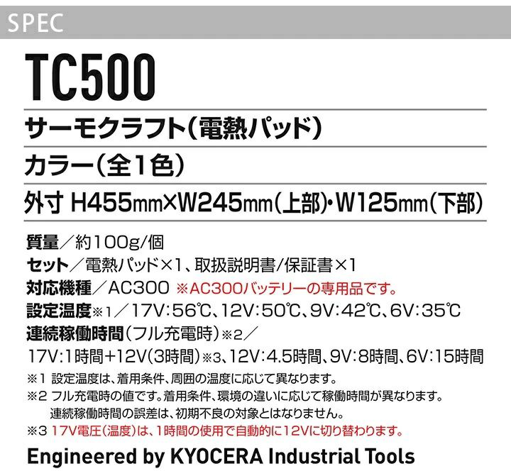 他の画像を見る バートルのエアークラフトバッテリーに対応した電熱パッド「サーモクラフト」。対応の防寒着と合わせて使用することで、寒い冬でも暖かく快適に過ごすことができます。 【即日発送】バートル サーモクラフト 電熱パッド TC500 単品 秋冬 防寒着 防寒服 作業服 作業着 BURTLE 発熱体 暖かい 2022 本体価格 ¥ 6,490 税込 詳細を見る お気に入りに登録する