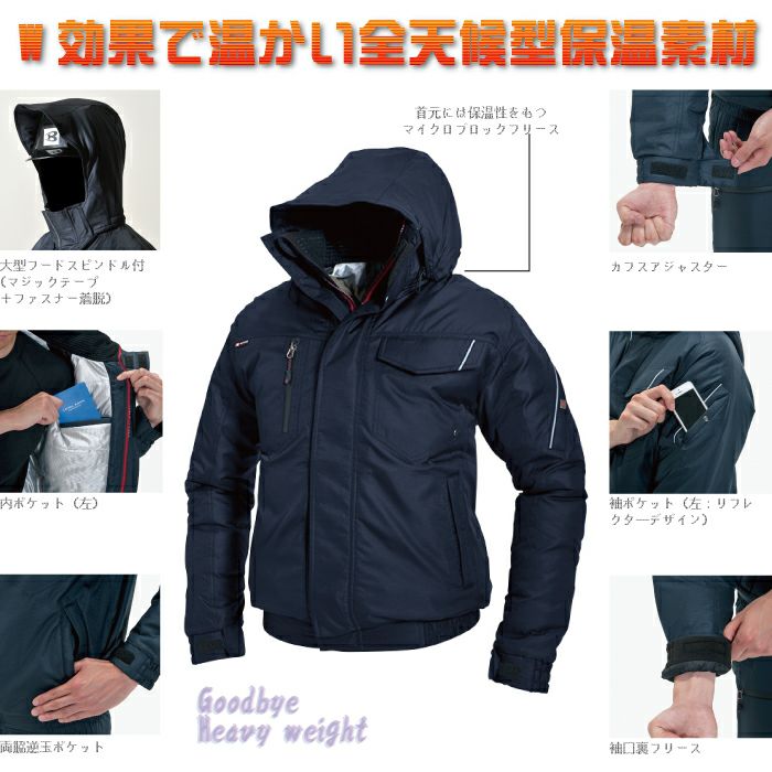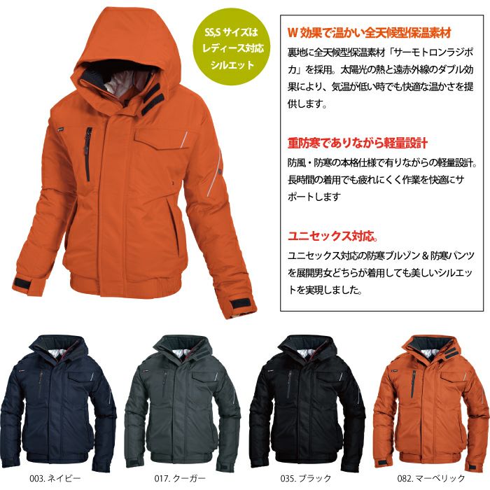 他の画像を見る リップストップ素材で引き裂きに強い、軽くて保温性抜群!【全天候型保温素材】【防風】【大きいサイズ有】 バートル 防寒ブルゾン 大型フード付 7210 男女兼用 メンズ レディース ジャケット ジャンパー BURTLE 防寒着 防寒服 作業着 作業服 アウトドア キャンプ 定価 ¥ 10,280 のところ 本体価格 ¥ 6,290 税込 カートに入れる お気に入りに登録する