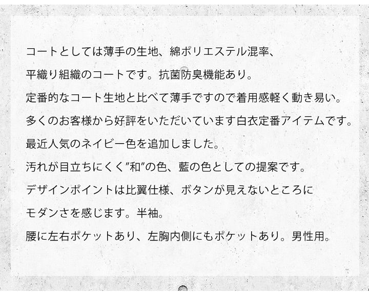 他の画像を見る 定番アイテムの調理着に新色ネイビーが登場。抗菌防臭加工生地使用。 セブンユニフォーム AA312 コート 半袖 男性用 メンズ 抗菌防臭 レストラン 調理用 厨房 白衣 飲食店 本体価格 ¥ 4,180 税込 カートに入れる お気に入りに登録する