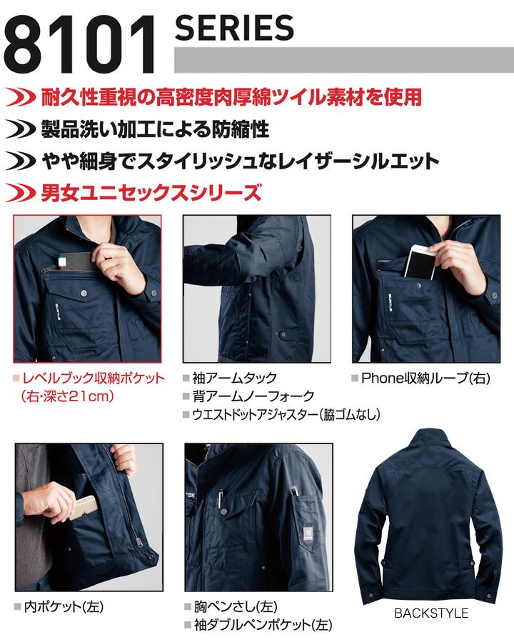 他の画像を見る 綿の耐久性を高めた高密度肉厚綿ツイル採用。ハード環境でタフに機能する。 バートル 長袖ジャケット 8101 男女兼用 メンズ レディース タフ素材 綿100% 細身 BURTLE【秋冬】ブルゾン ジャンパー 作業服 作業着 8101シリーズ 本体価格 ¥ 5,060 税込 カートに入れる お気に入りに登録する