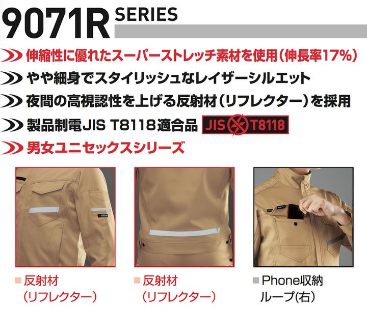 他の画像を見る ハードな動きに対応する快適ストレッチ素材シリーズ。高視認リフレクターの装着で夜間作業にも対応! バートル 長袖ジャケット 9071R 反射 男女兼用 メンズ レディース 制電 細身 BURTLE【秋冬】ブルゾン ジャンパー 作業服 作業着 9071Rシリーズ 本体価格 ¥ 4,290 税込 カートに入れる お気に入りに登録する