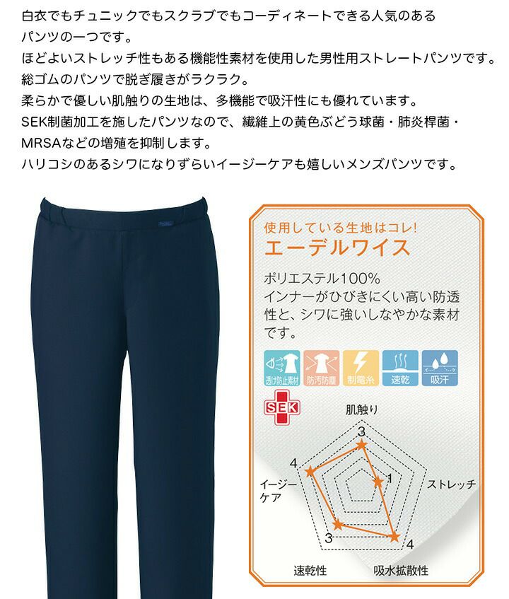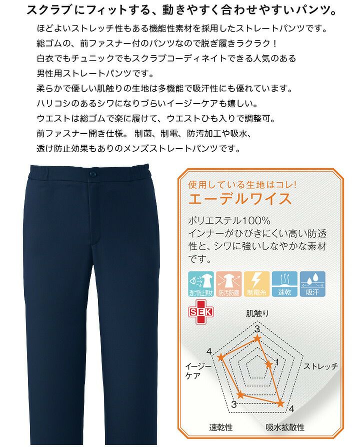 他の画像を見る 白衣でもチュニックでもスクラブでもコーディネートできる人気のあるパンツです。 【メール便送料無料※代引不可】メンズパンツ フォーク 5015EW 男性用 ズボン 制電 吸汗 速乾 制菌 SEK 防汚防塵 医療 医師 医者 病院 制服 FOLK【S-4L】 本体価格 ¥ 5,500 税込 カートに入れる お気に入りに登録する